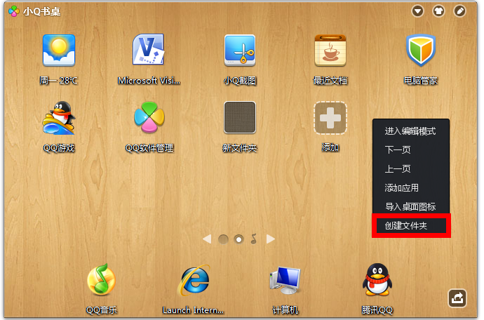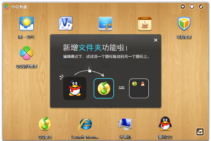 删除:将“小Q书桌”操作界面中已有的图标拖出到桌面上,表示不再受管理。